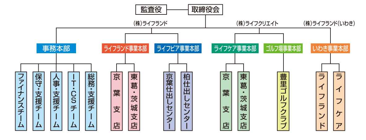 | 運営 | 総合葬祭式場 ライフケア鎌取会堂/ライフケア津田沼 ライフケアメモリイプレイス松戸 ライフケアメモリイパーク柏 ライフケア土浦会堂/ライフケア平会堂をはじめ44カ所 ゴルフ場 豊里ゴルフクラブ |